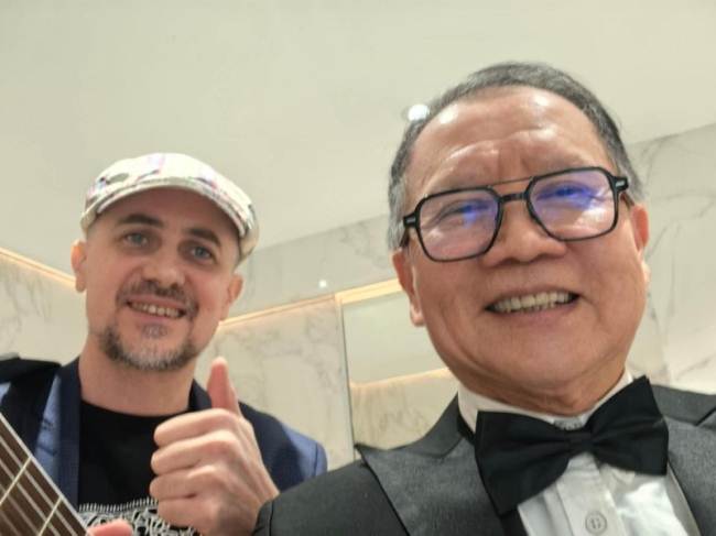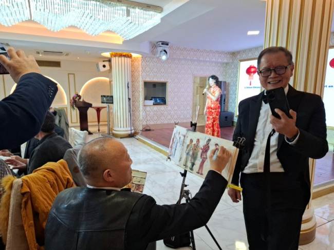 晚会间,艺术家纷纷“献艺”,朋友相互交换礼品。沈斯先生持画笔记录晚会情景 斌与【马来西亚侨团】主席 叶俊聪先生演唱了【黄河颂】